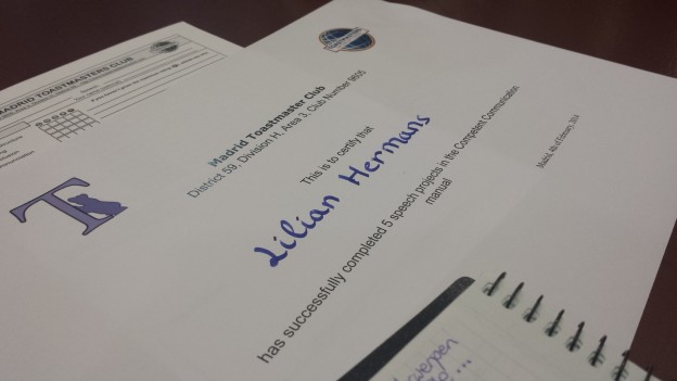 But this meeting had something new too. Toastmasters Madrid held a short Awards Ceremony for those members who show commitment and have done 5 speeches or more. This recognition will become a tradition in our club. But beyond celebrating our past success, we are focused on the future. As an incentive to keep on learning and improving, Alex, Pilar, Alberto, Lilian, José and Aline received a homemade Certificate and a Toastmasters International pin. Our Club President, Jaime led a warming and friendly presentation, in which members who could not attend (Guillermo, Ana V., Javier and Irene) were also recognized for achieving such an important milestone in their Communication Track.